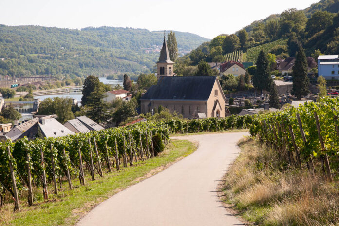 Een van de mooiste wandelingen van de regio Moezel is ‘Grenzeloos Schengen‘. Deze voert je door een oud bos steeds dieper de heuvels in. Je klimt door tot je aan een zuidelijke bosrand ineens uitkijkt op het Franse kuuroord Contz-les-Bains, aan de overkant van de Moezel. Daar zie je onder meer het eeuwenoude kasteel van de hertogen van Lotharingen, een spoorlijn langs het water, een kerktoren en een brug. Je volgt de lus in de rivier richting Duitsland, daalt soms een stukje af en klimt dan weer terug. Lange tijd wandel je met zicht op Contz-les-Bains, dat je langzaam achter je laat.